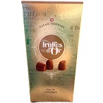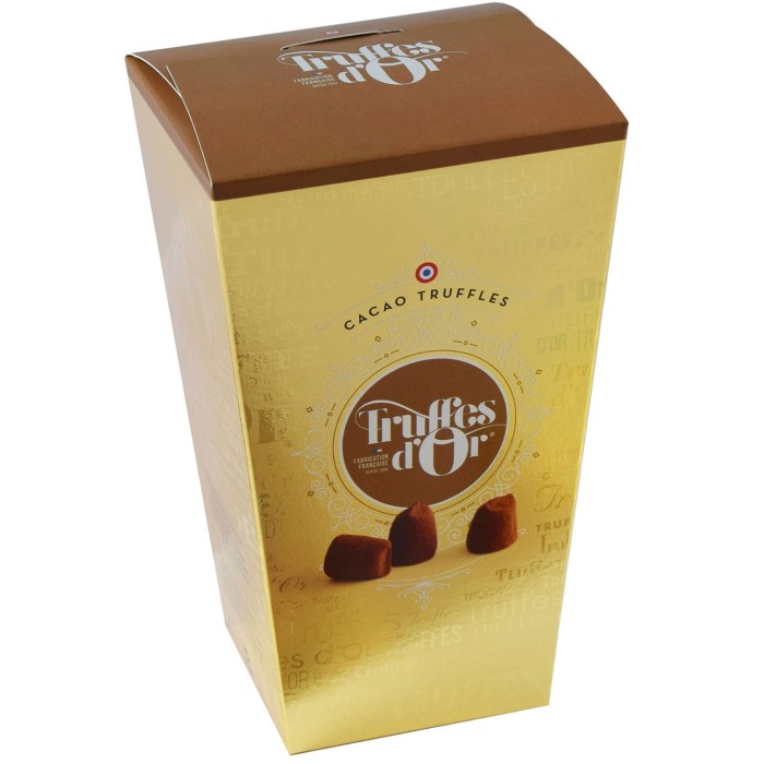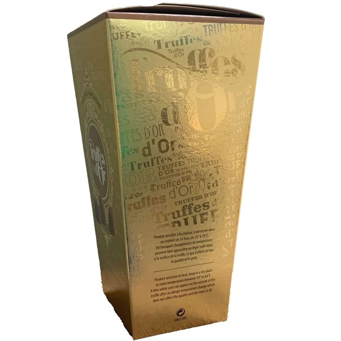 En elegant presentask fylld med krämiga franska chokladtryfflar smaksatta med champagne. Den lena konsistensen och den rika smaken gör tryfflarna till en perfekt avslutning på middagen eller en lyxig detalj till kaffet. Den stora gyllene asken gör sig lika bra på festbordet som som en exklusiv gå-bort-present.