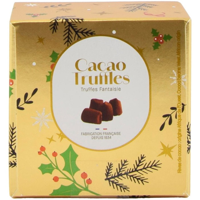 Lyxig fransk Champagnetryffel i en vacker gyllene presentask - en elegant delikatess att fira jul och nyår med. Tryffeln har en len, krämig konsistens och en fyllig smak med toner av champagne som gör varje tugga till en festlig upplevelse. Perfekt som gåva, dessert eller till en kopp kaffe efter middagen.