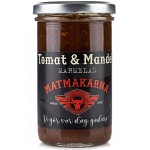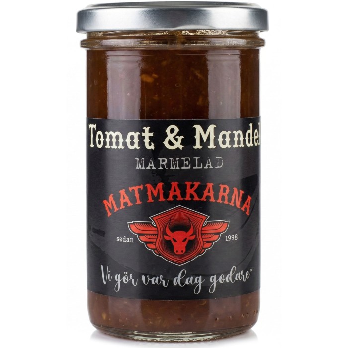 Tomat 51%, socker, citron, fruktpektin, mandel 1%, vanilj,chili. Fruktmängd 52g/100g. Totalmängd socker 45g/100g.