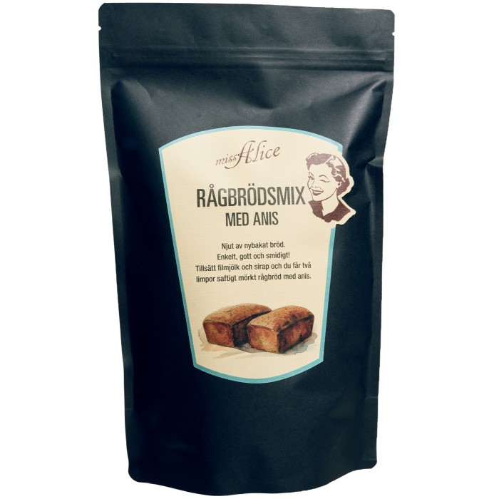 På Miss Alice krog har de i alla år serverat ett riktigt gott rågbröd till flera rätter. Därför har denna brödmix uppkommit! Det enda som behöver tillsättas är filmjölk och sirap. Mixen räcker till två ordentliga limpor och går utmärkt att frysa! Brödet är alltid gott nybakat med smör men det håller sig mjukt och saftigt i flera dagar. Prova att rosta rågbrödet och avnjut med lagrad prästost och aprikosmarmelad. Eller stek brödskivorna i basilika & vitlöksolja och servera till salladen eller tapasbrickan.