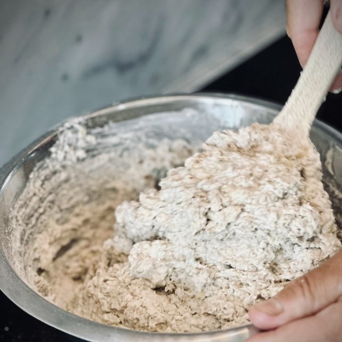 2. Häll brödmixen i en bunke och tillsätt 1L filmjölk och 1dl sirap. Blanda runt med en slev.