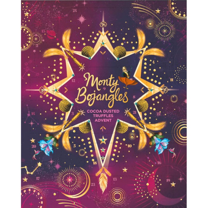 Fantasifull, detaljrik och drömmig adventskalender från härliga Monty Bojangles. Räkna ner till julen med läckra chokladkakaotryfflar varje dag, med 3 st på den sista dagen.