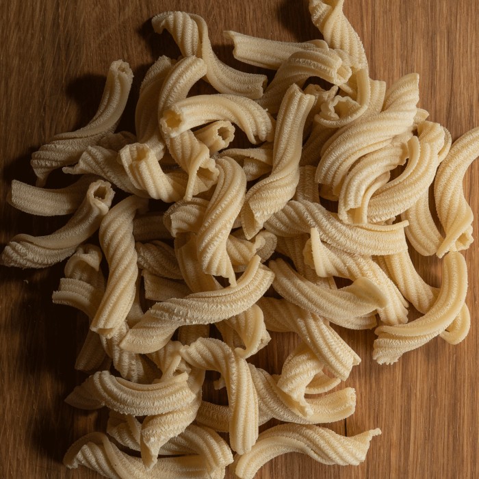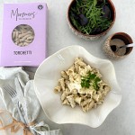 Kort, vriden pasta med grov yta och ihålig form. Torchetti är gjord för att fånga upp sås på ett effektivt sätt.