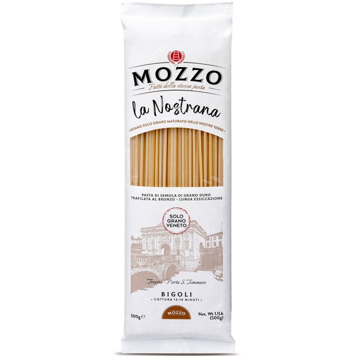 Mozzo Bigoli Pasta är bronsvalsad och tillverkad av 100 % durumvete av högsta kvalitet. Långsam torkning på låg temperatur bevarar smak, näring och hög proteinhalt. Bigoli kommer från Veneto och är något tjockare än vanlig spaghetti med en lätt grövre yta som gör att såser fäster bättre.