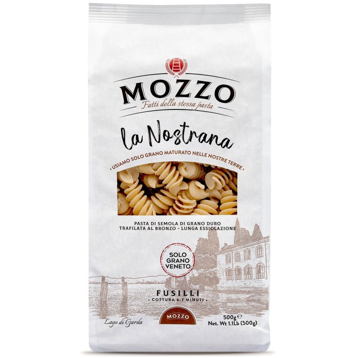 Mozzo Fusilli Pasta är bronsvalsad och tillverkad av 100 % durumvete av högsta kvalitet. Den långsamma torkningen på låg temperatur bevarar smak och näring samt den höga proteinnivån. Den klassiska spiralformen, med ursprung från norra och centrala Italien, binder såser väl och passar både till långkokt ragu och pesto.