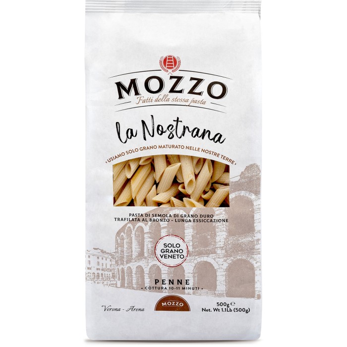Mozzo Penne Pasta är bronsvalsad och tillverkad av 100 % durumvete av högsta kvalitet. Långsam torkning på låg temperatur bevarar både smak, näring och hög proteinhalt. Penne är en klassisk pastaform som passar utmärkt till raguer som Bolognese och till gratänger, där pastan fångar upp sås och smaker på bästa sätt.
