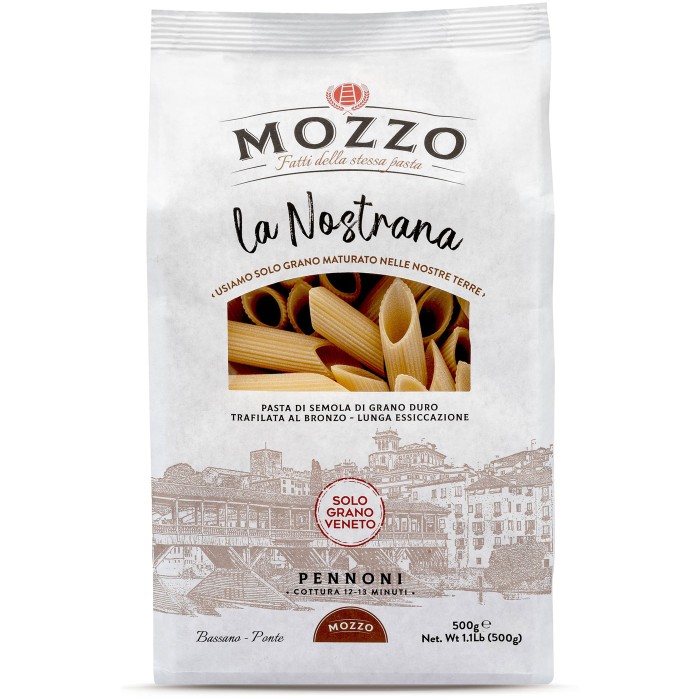 Mozzo Pennoni Pasta är bronsvalsad och tillverkad av 100 % italiensk durumvete av högsta kvalitet. Den långsamma torkningen på låg temperatur bevarar smak, näring och hög proteinhalt. Pennoni är en större variant av den klassiska pennepastan och passar särskilt bra till fylliga rätter och gratänger där pastan får suga åt sig sås och smaker.