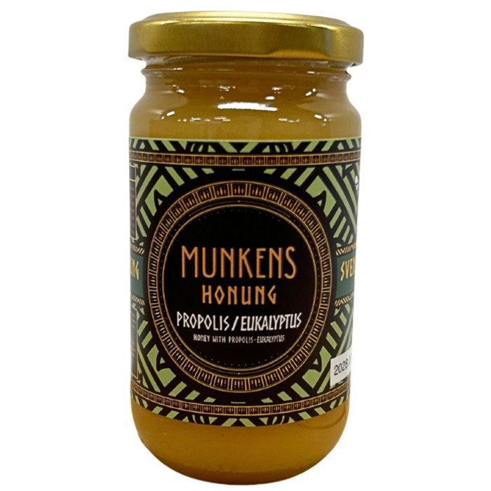 Svensk honung från Munkens Hälsa – här kombinerad med eucalyptus och propolis.