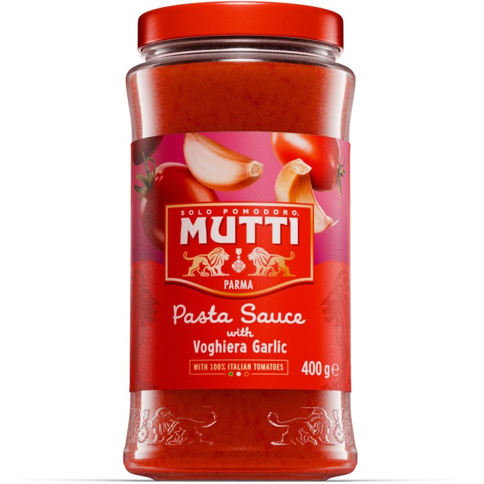 Förutom Muttis finkrossade tomater innehåller tomatsåsen utsökt Aglio di Voghiera D.O.P vitlök.