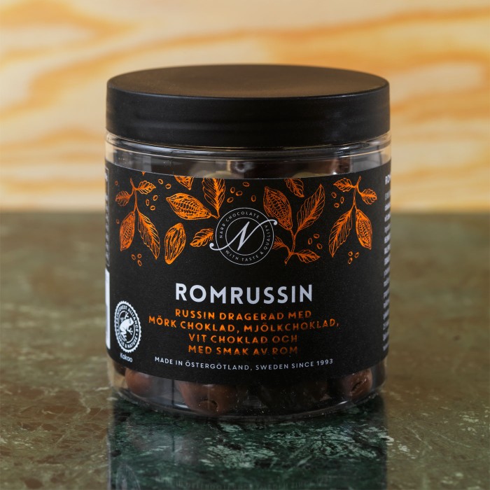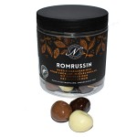 Russin med smak av rom, dragerade med mörk choklad, mjölkchoklad och vit choklad.