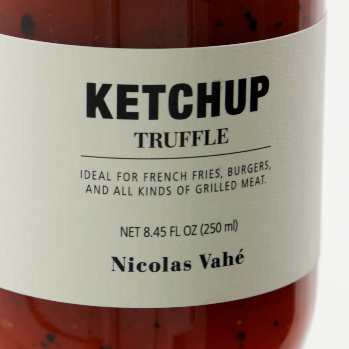 Tomatketchup med svart tryffel. Ingredienser: San Marzano-tomater 24%, tomatpasta, vatten, socker, äppelcidervinäger, vinäger, svart tryffel (Tuber Aestivum Vitt) 3%, modifierad stärkelse, salt, SELLERI.