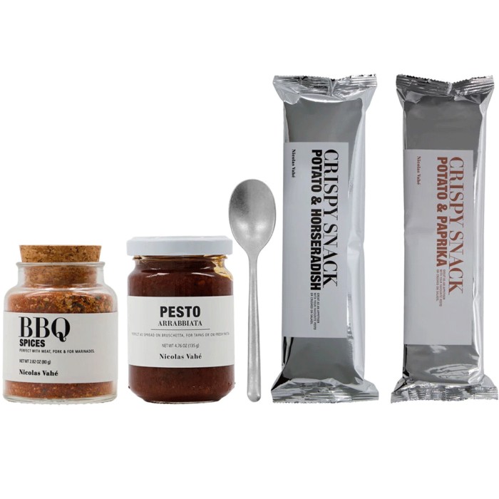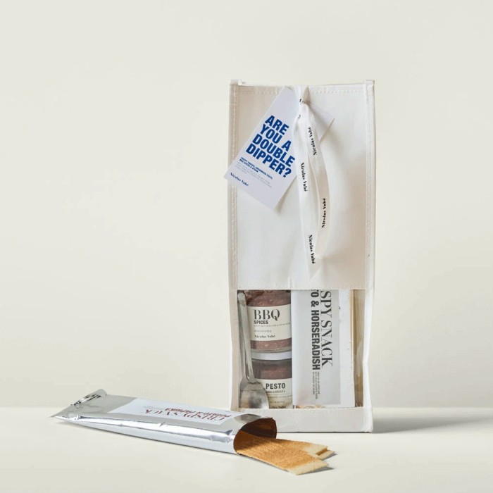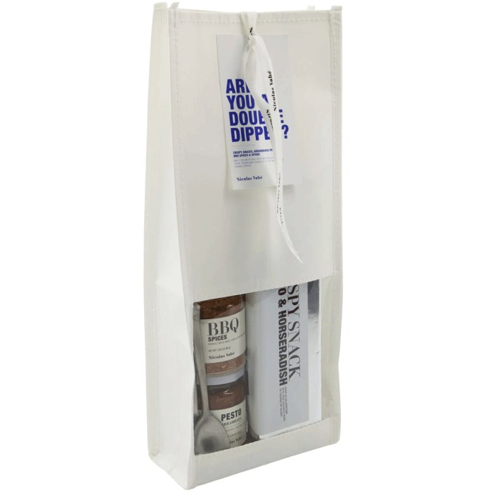Nicolas Vahé presentpåse ”Are You a Double Dipper?” är en smakfull och elegant gåva för alla som uppskattar goda snacks och spännande smaker. Perfekt att bjuda på vid sociala tillfällen eller att njuta av själv.