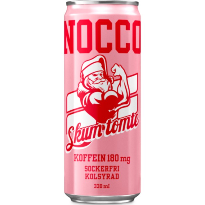NOCCO Skum Tomte är en kolsyrad dryck berikad med BCAA (grenade aminosyror), koffein och vitaminer. Denna variant har en smak av skumtomte. Innehåller sötningsmedel.