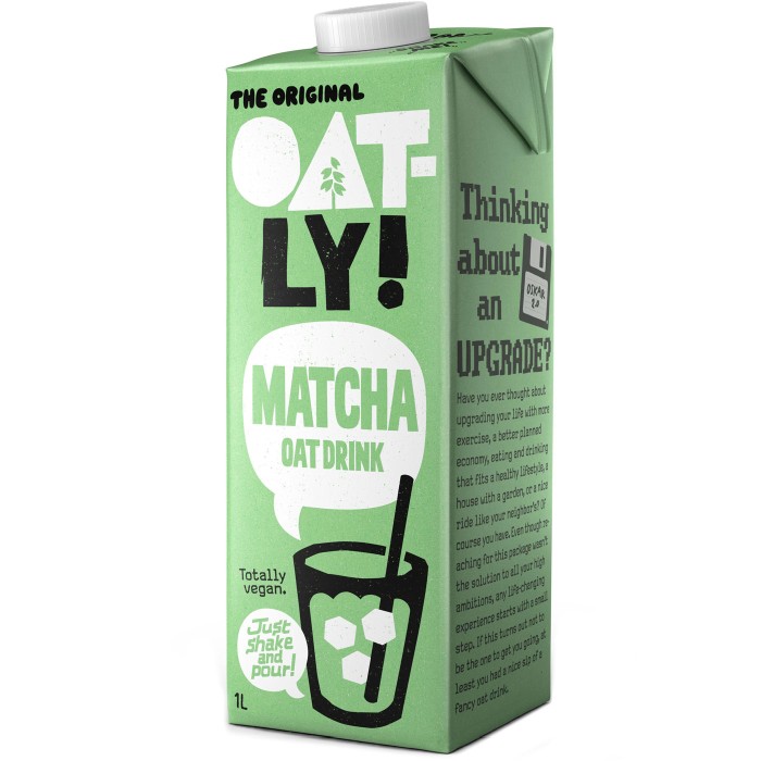 Vatten/ vann/ vand, HAVRE 9%, rapsolja, socker 1,5%, ekologiskt grönt matchatepulver / økologisk, pulverisert matcha grønn te 0,8%, mineral (kalciumkarbonat), salt, naturlig arom, stabiliseringsmedel/ stabilisator (gellangummi).