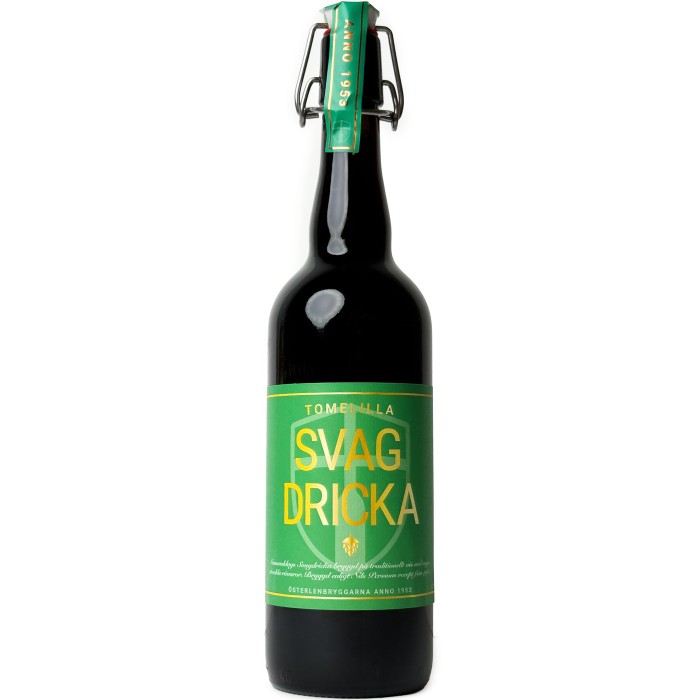 Svagdricka från Österlenbryggarna med recept från 1953, här i större flaska om 75cl. Denna svagdricka är en av ett fåtal i Sverige som fortfarande bryggs på gammalt vis där man lämnar en bottensats av jäst, så produkten själv får mogna och få sin naturliga kolsyra, smak och kraft.