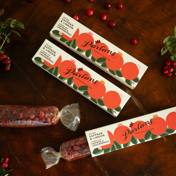 En större bit kola där Pärlans kärlek till hantverket får lysa igenom, inslagen för hand och toppad med lyxiga godsaker. Dela med någon du har kär, eller smyg upp ur fickan och ta en tugga rakt av. En oemotståndlig jul-kombo av saffranskola och lingon.