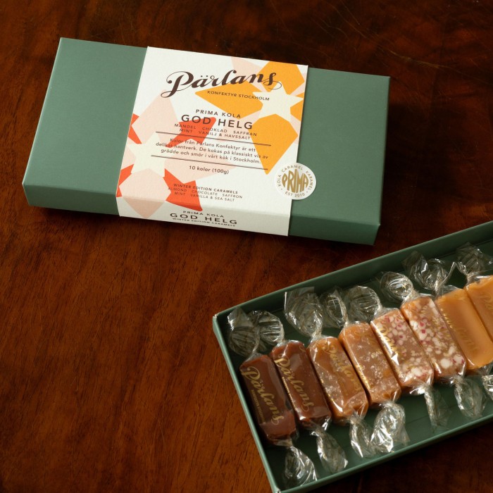 Pärlans klassiska kolor inslagna i cellofan, prydligt packade i ask, till dig eller någon du har kär. Deras julask GOD HELG är fylld med en blandning av säsongens godaste smaker och deras klassiker - MANDEL, CHOKLAD, SAFFRAN, MINT och VANILJ & HAVSSALT.