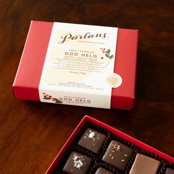 Årets julask bjuder på två oslagbara favoriter och två helt nya, gyllene smaker som passar säsongen särskilt väl. Önska dig själv eller någon du gillar en riktigt god helg med denna julask, 12 bitar mjuk kola i choklad i säsongens godaste smaker - SAFFRAN, TRIPPELCHOKLAD, VANILJ & HAVSSALT och ARRAK.