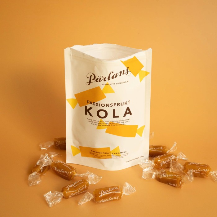 Unna dig en bit sommar i form av en påse syrligt söta passionsfruktskolor. Gräddiga kolor kokade på klassiskt vis från Pärlans kolafabrik - packade i lufttät, återförslutningsbar påse för att hålla dem mjuka och färska ännu längre.