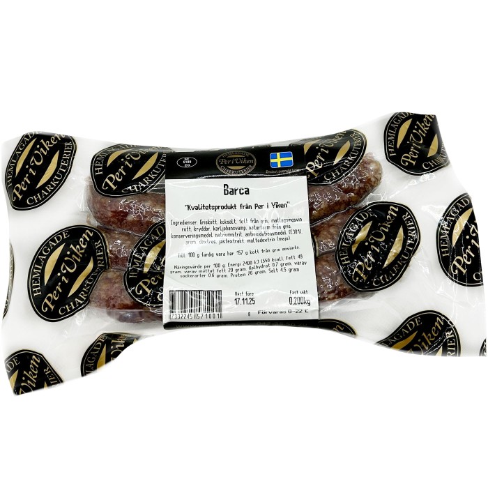 En mild kryddad ölkorv med influenser från den spanska Fuet. Denna ölkorv från Per i Viken är en lufttorkad tapaskorv med mild karaktär. Barca är tillverkad enligt traditionellt hantverk i företagets charkuteri i Höganäs.