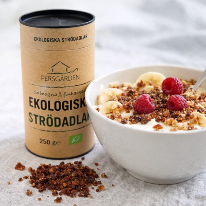 Persgården Ekologiska Solmogna Strödadlar är en smakrik och naturlig ingrediens som ger en härlig sötma till både matlagning och bakning. Dessa strödadlar är varsamt torkade och finfördelade för att enkelt kunna användas som topping eller som ett alternativ till raffinerat socker.