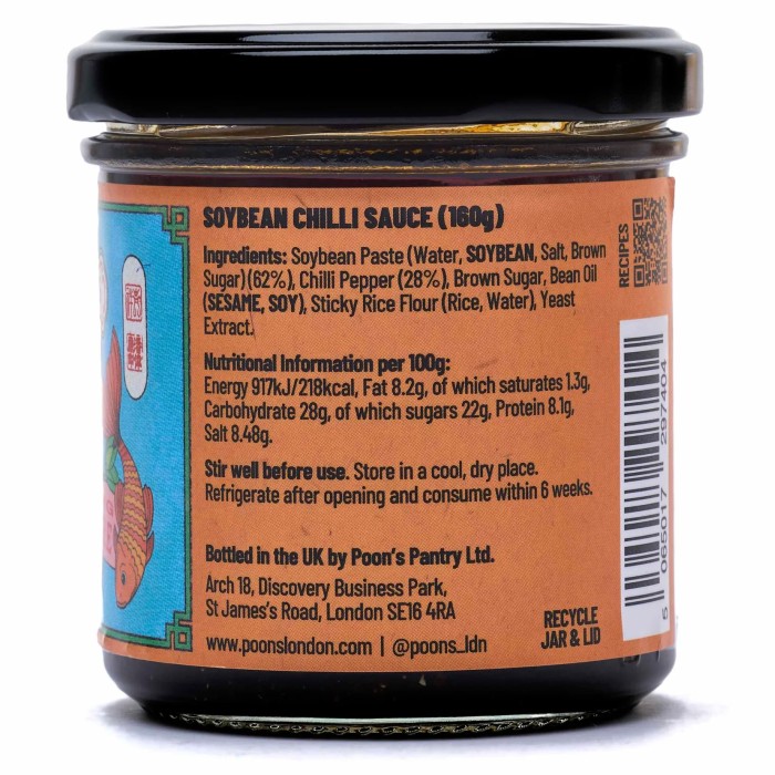 Ingredienser: Sojabönspasta (vatten, SOJABÖNA, salt, farinsocker) (62 %), chilipeppar (28 %), farinsocker, bönolja (SESAM, SOJA), klibbigt rismjöl (ris, vatten), jästextrakt. Näringsvärden per 100g: Energi 917 kJ/kcal 218, Fett 8,2g, varav mättatfett 1,3g, kolhydrater28g, varav sockerarter 22g, Protein 8.1g, Salt 8,48g