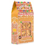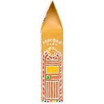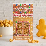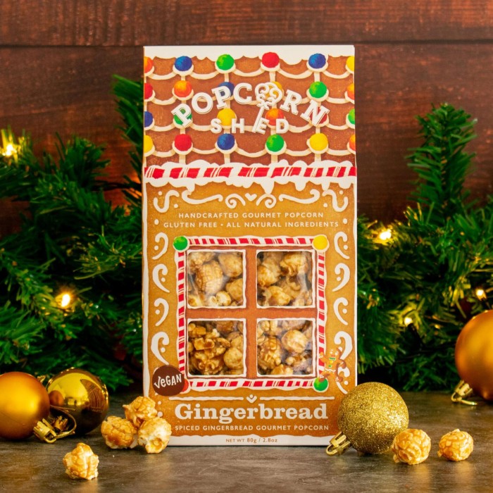 Karamelliserade popcorn med smak av pepparkaka i pepparkakshusförpackning. Vegansk.
