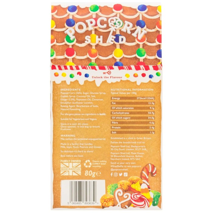 Poppade majskorn (26%), socker, glukossirap, ljus sirap, kokosolja, salt, ingefära (1%), rapsolja, kanel, emulgeringsmedel: solroslecitin, jäsmedel: natriumvätekarbonat, naturlig arom. Tillverkad i en fabrik som hanterar GLUTEN, JORDNÖTTER, SOJA, MJÖLK och NÖTTER. Lämplig för veganer. Endast naturliga ingredienser. Förvars svalt och torrt. Återförslut efter öppnande. Kan innehålla opoppade majskorn.