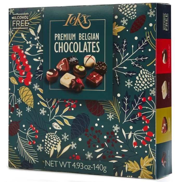 En vacker presentask med nio alkoholfria praliner av belgisk choklad.