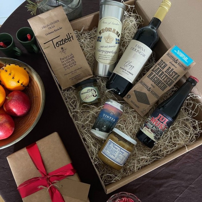 Den kommer vackert paketerad med svenskt träull som skyddar innehållet och ger ett exklusivt, naturligt intryck. Perfekt som företagsgåva, julklapp till kunder eller som en festlig present till någon som uppskattar kvalitet och hantverk.