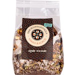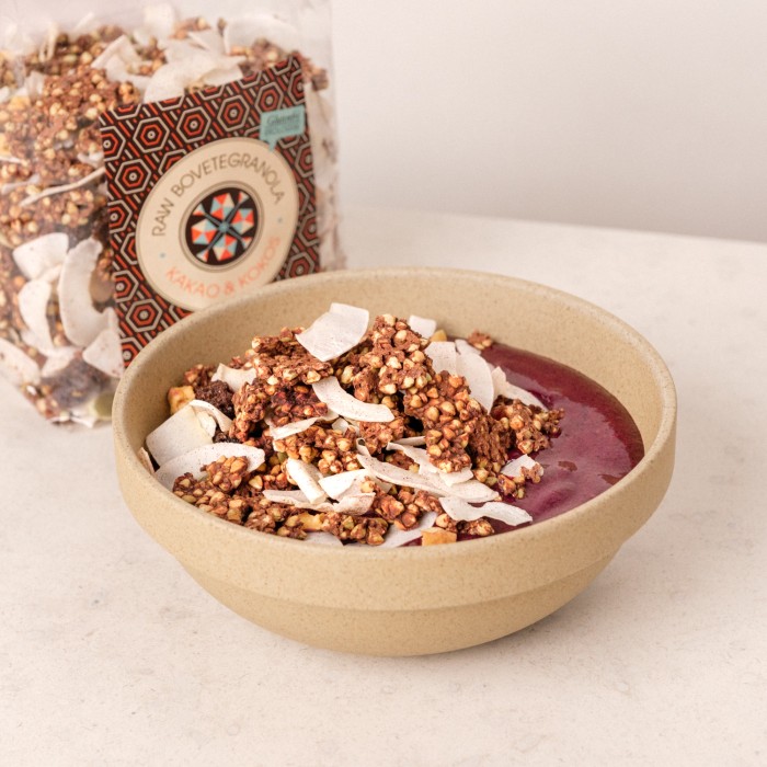 Renée Voltaires Raw Bovetegranola är handgjord efter unikt recept och med extra mycket kärlek i deras egna kök. Noga utvalt bovete och pumpakärnor har omsorgsfullt blötlagts för att ta bort de annars svårsmälta fytinsyrorna, blandas med chiafrön, kakao och kokos och torkas därefter varsamt för att bevara så mycket näring som möjligt. Smaksatt med ekologisk agave och sötad med en skvätt äppeljuice för att runda av smaken på den annars lite skarpa raw kakao, inget annat.