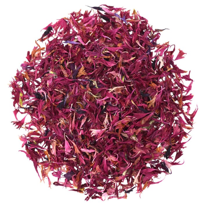 Torkade röda blåklintblommor, fria från tillsatser. Näringsvärde per 100 g: Energi: 0 kJ/ 0 kcal, Fett: 0 g, - varav mättat fett: 0 g, Kolhydrater: 0 g, - varav sockerarter: 0 g, Protein: 0 g, Salt: 0 g