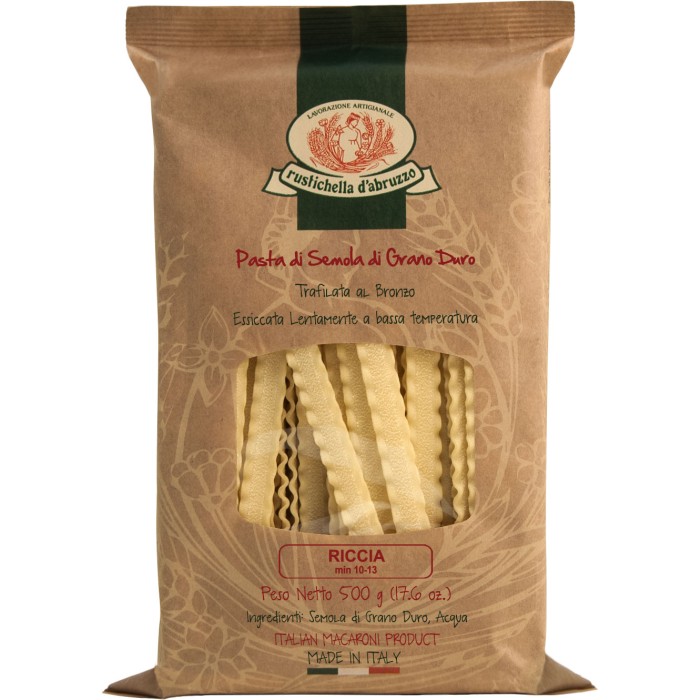 Rustichella d’Abruzzo Riccia-Mafaldine är en högkvalitativ durumvetepasta från regionen Abruzzo. Tillverkningen kombinerar noggrant utvalt durumvetemjöl med friskt källvatten och traditionella bronsmunstycken, vilket ger pastan dess karakteristiska rynkiga yta som gör att såsen fäster perfekt.