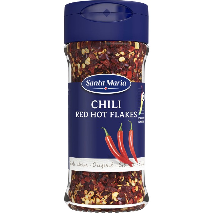 Santa Maria Red Hot Chili Flakes är en dekorativ och stark grovkrossad chilipeppar av hög kvalitet. Santa Maria Red Hot Chili Flakes är en lagom het och aromatisk chilipeppar lika lämplig vid matlagning som till bordskrydda. Grov chilipeppar kan fräsas med vitlök i olivolja, för en bra grund till en italiensk pastasås. Santa Maria Red Hot Chili Flakes är också gott att strö över pizza, pasta, grillat kött, kyckling, fisk och grönsaker.