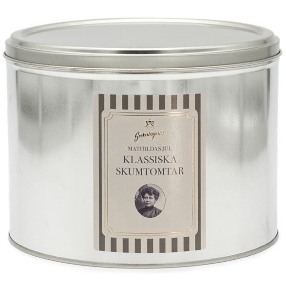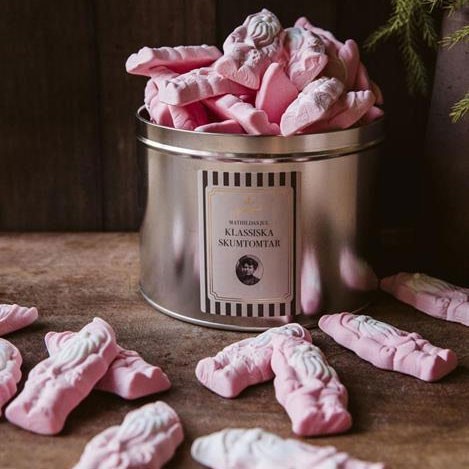 Mathildas skumtomtar i vacker plåtburk. Producerad och handpackad i Sverige.