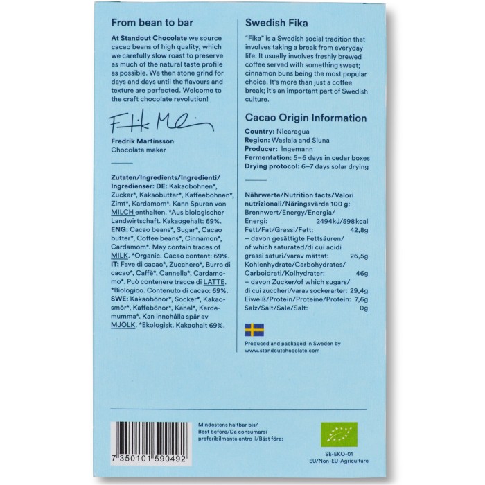 Kakaobönor*, socker*, kakaosmör*, kaffebönor*, kanel*, kardemumma*. Kan innehålla spår av MJÖLK. *Ekologisk. Kakaohalt 69%.