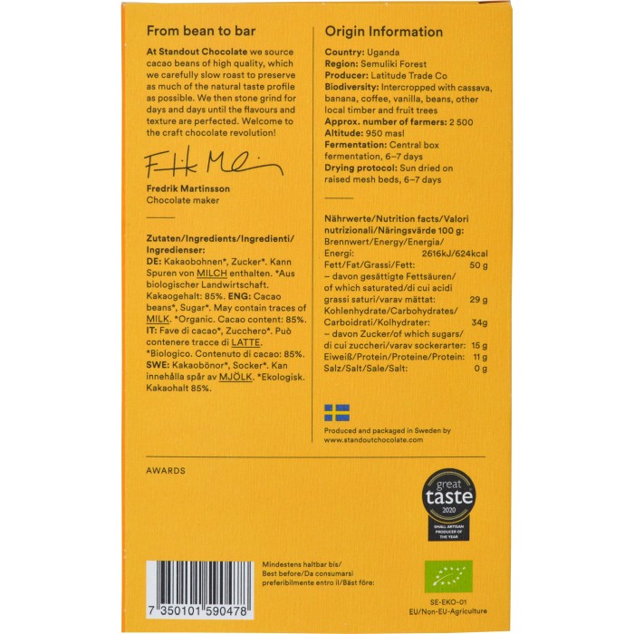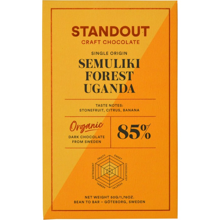 Standout Semuliki Forest Uganda 85 % är en ekologisk single origin-mörk choklad för dig som vill ha mycket kakaokaraktär men samtidigt tydlig fruktighet. Kakaobönorna kommer från Semuliki Forest i Uganda och förädlas av Standout Chocolate i Göteborg - från böna till färdig kaka i liten skala för maximal smakprecision.