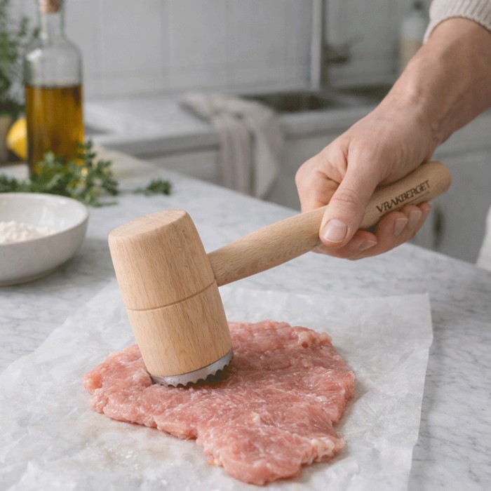 Vrakberget Köttbankare i Bokträ är ett robust och funktionellt köksredskap i obehandlat bokträ, perfekt för matlagning från grunden. Den används för att möra kött eller jämna ut tjockleken på köttbitar inför stekning, vilket ger ett jämnare och bättre tillagningsresultat.