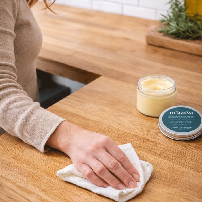 Vrakberget Träkräm 200ml är en effektiv och naturlig återfuktare för alla typer av träslag. Den är perfekt för skärbrädor, smörknivar, bänkskivor och andra träredskap som behöver vård och skydd i vardagen.