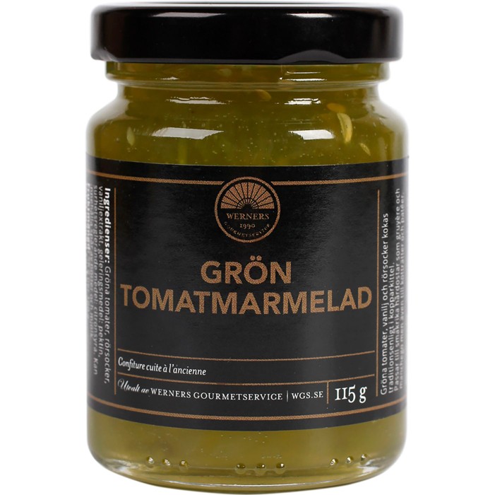 Gröna tomater, vanilj och rörsocker kokas traditionsenligt i kopparkittel. Passar till smakrika hårdostar som gruyère och manchego menäven till kötträtter och patéer.