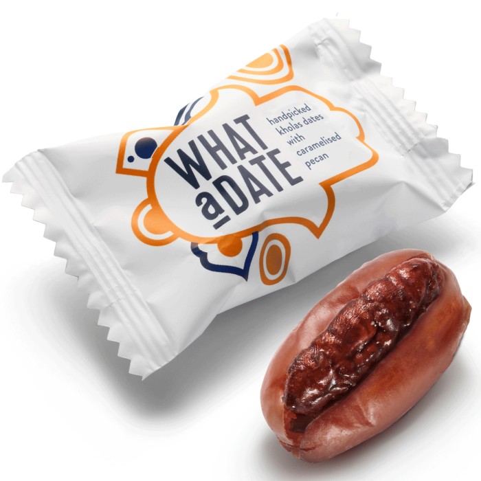 What a Date Pecan kombinerar naturligt söta, mjuka dadlar med noggrant utvalda pekannötter för en lyxig och balanserad smakupplevelse. Ett tunt krispigt lager ger en fin textur som lyfter varje tugga. Tillverkad med rena ingredienser utan aromer, fyllnadsmedel, konserveringsmedel eller smakförstärkare – bara naturlig och genuin smak.