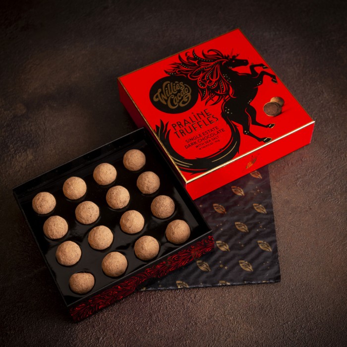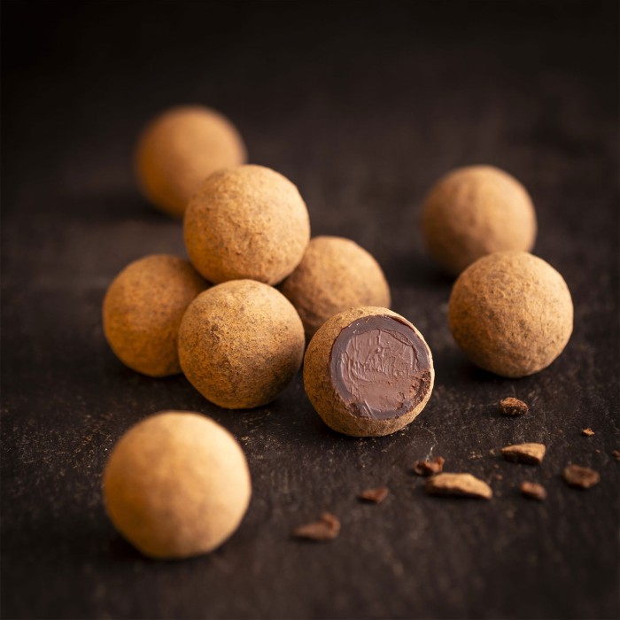 Enastående chokladtryfflar av mörk single estate choklad, finhackade och nyrostade hasselnötter med en touch av flingsalt.